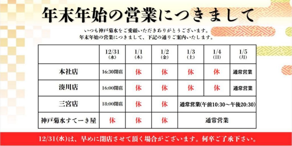 年末は店舗により閉店時間が通常と異なりますので、