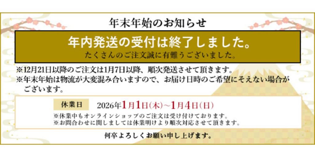 昨日をもちまして、年内発送のご注文受付を終了いたしました。